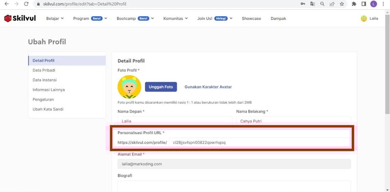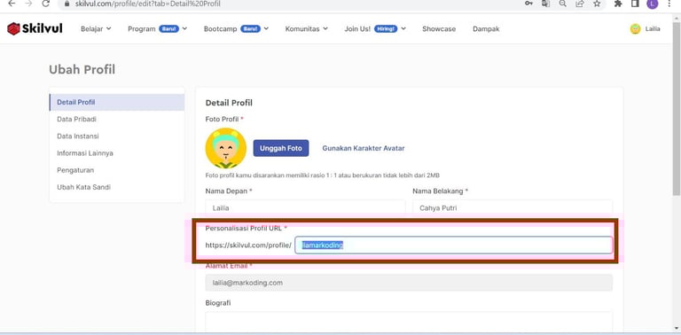 Ubah Personalisasi Profil URL sesuai yang kamu inginkan. dan perlu diperhatikan ⚠️ kamu hanya dapat mengubah 1x