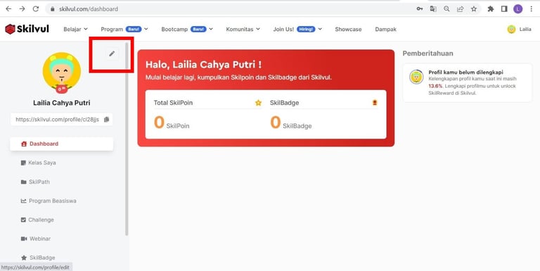 Setelah di klik "Dashboard", akan muncul tampilan seperti ini. kemudian klik tombol edit (ikon pensil) di dekat foto profile sebelah kiri atas.